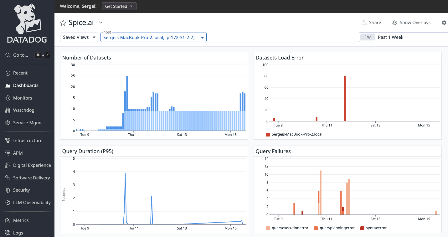 Spice can be monitored with Datadog using the Spice Metrics Endpoint and pre-built dashboards available in the Spice repository.