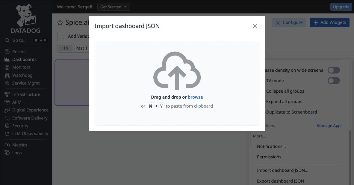 1. Click Import dashboard JSON and drag and drop monitoring/datadog-dashboard.json file