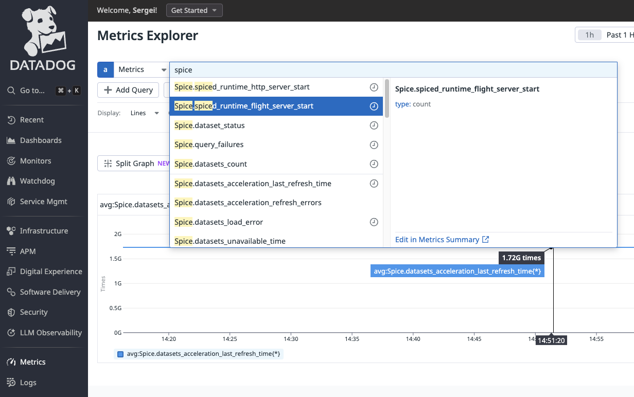 3. Open Datadog Metrics Explorer and type spice to confirm Spice telemetry information is successfully collected.